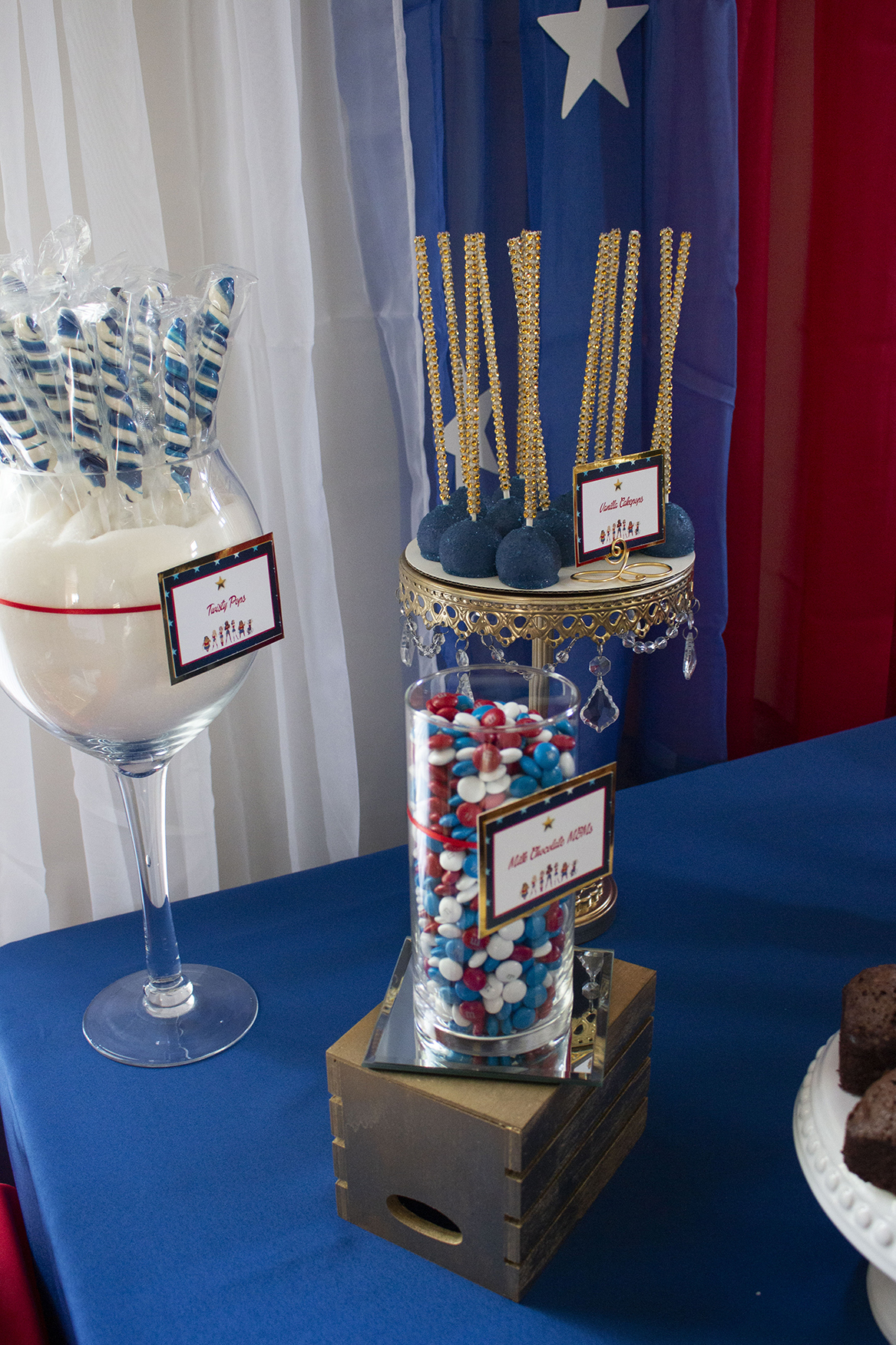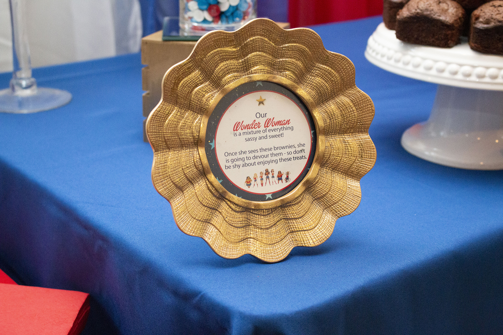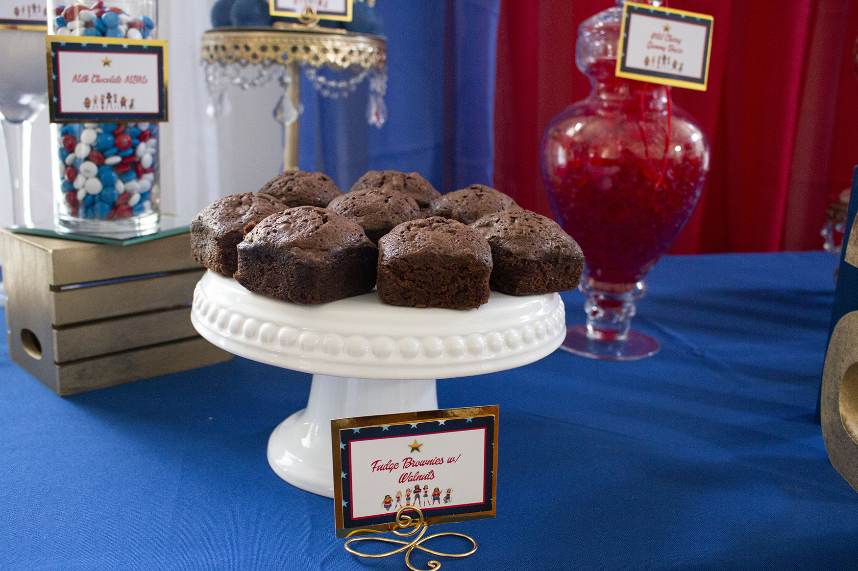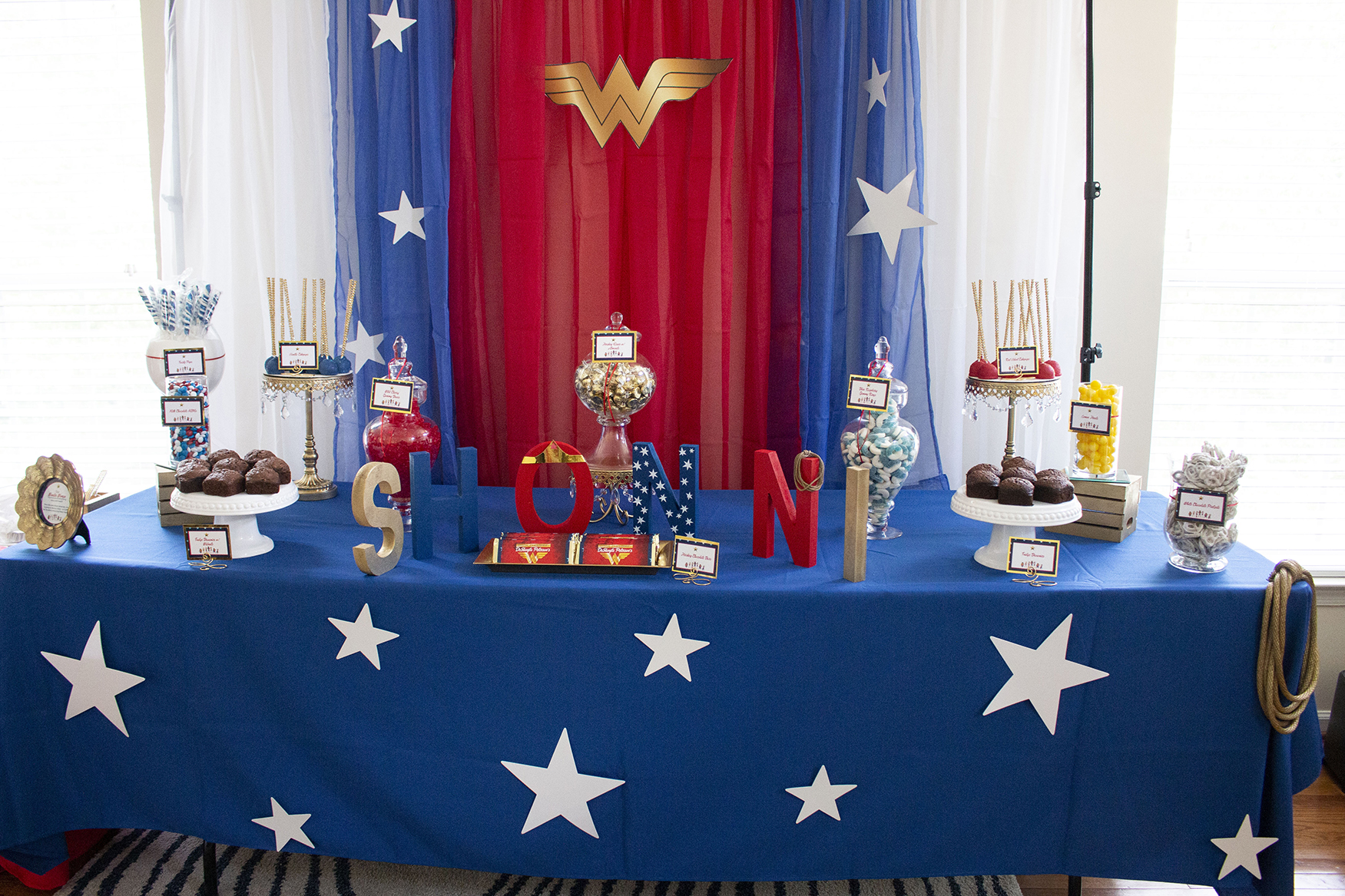 For décor, we pulled together all of the elements of red, white and blue with a touch of gold – befitting of our Wonder Wonder. One of the signature decor elements to our tables is our personalized letters which complete with the logo, a custom made sign and letters spelled out in her name. We believe Shonni still has the letters until this day.
