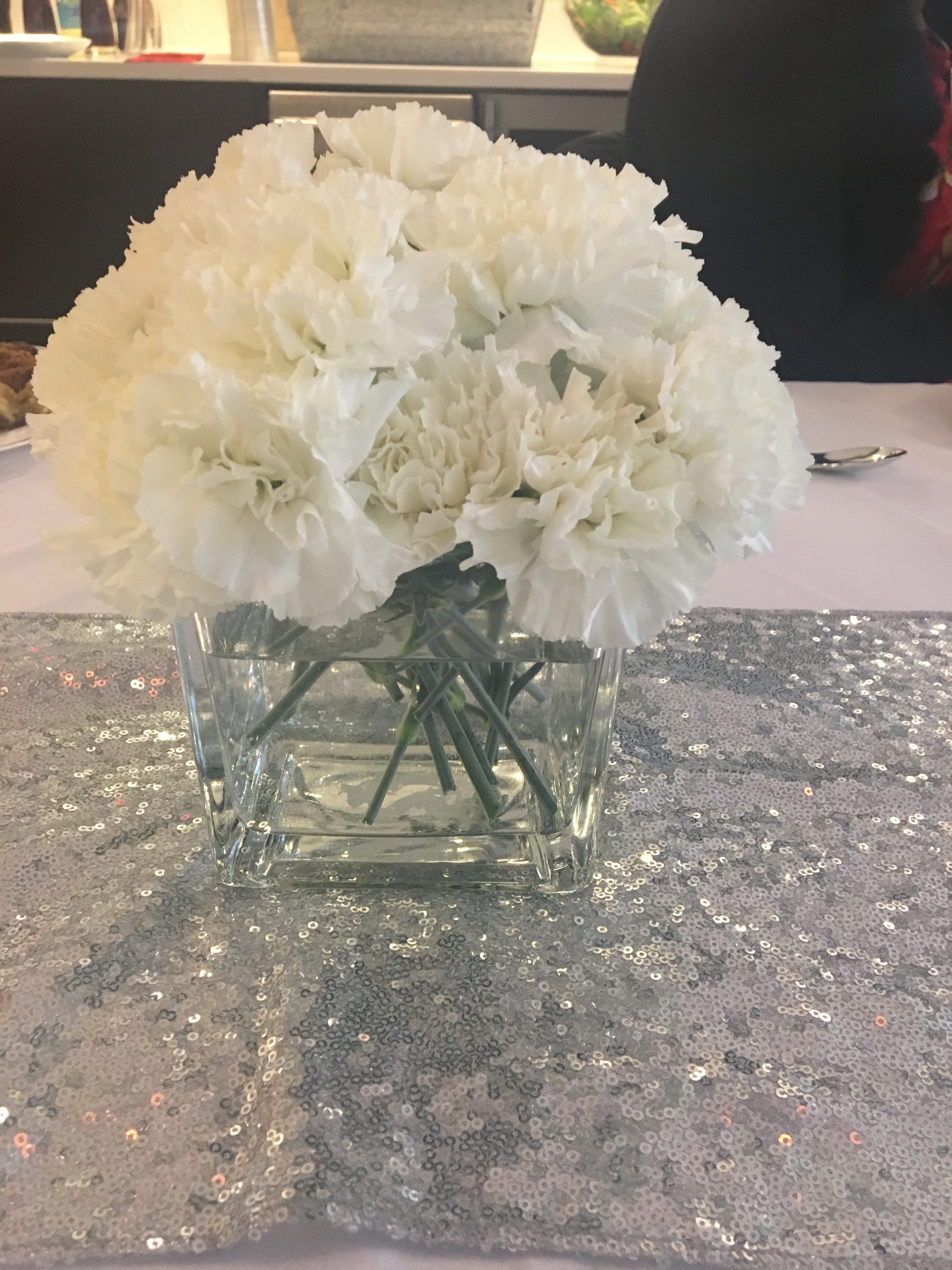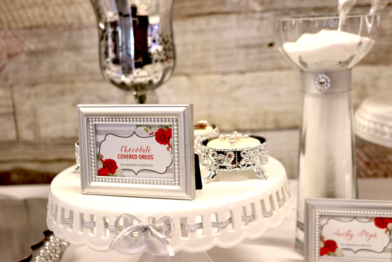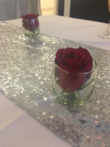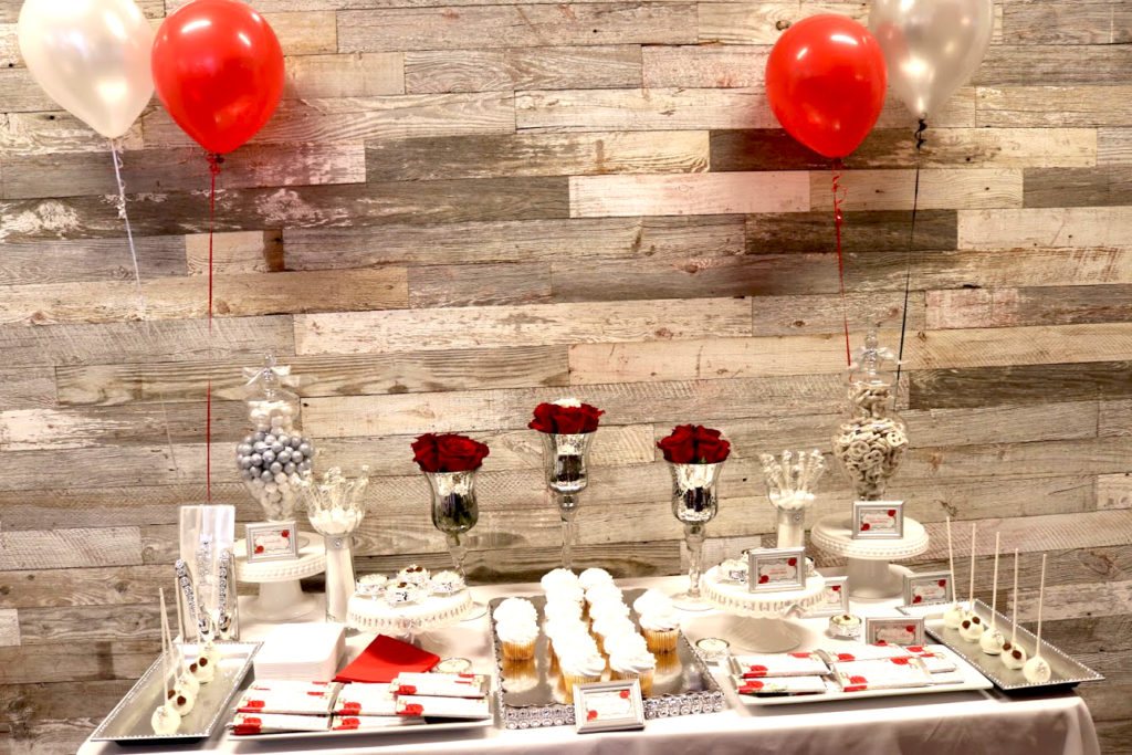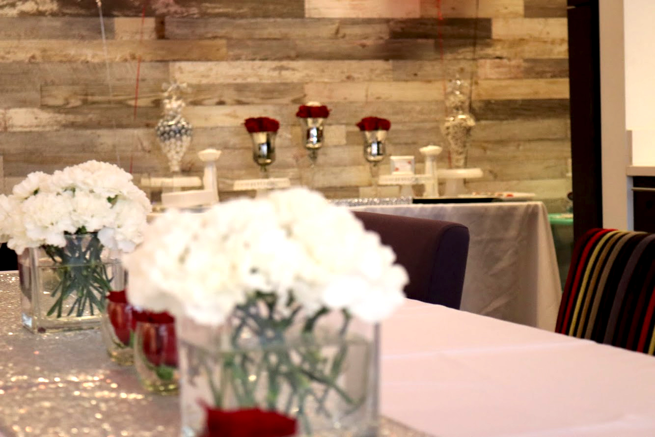 This busy mom and dad called on us to help coordinate and setup for the reception for their daughter’s christening. We managed all vendors and setup while the family enjoyed this sacred event. We provided a simple décor design as requested. Beautiful white and red roses in glass jars with a sequin runner accent. We also placed enlarged photos as well as smaller photos in frames around the room for an added touch.
