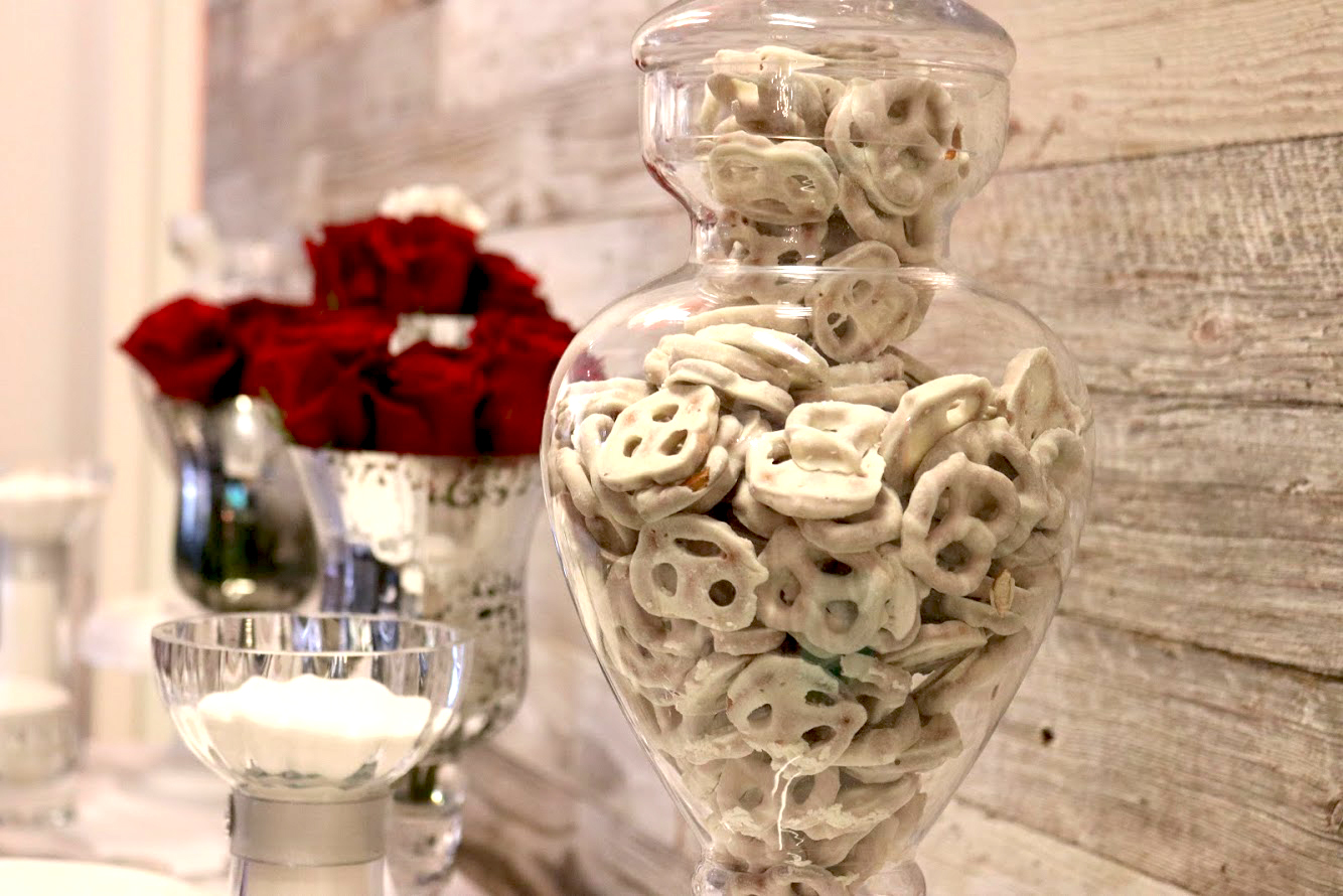 For this dessert table we went for a clean elegant look. Apothecary jars with tasty sweets, beautiful mercury goblets with red roses, and silver trinket boxes.