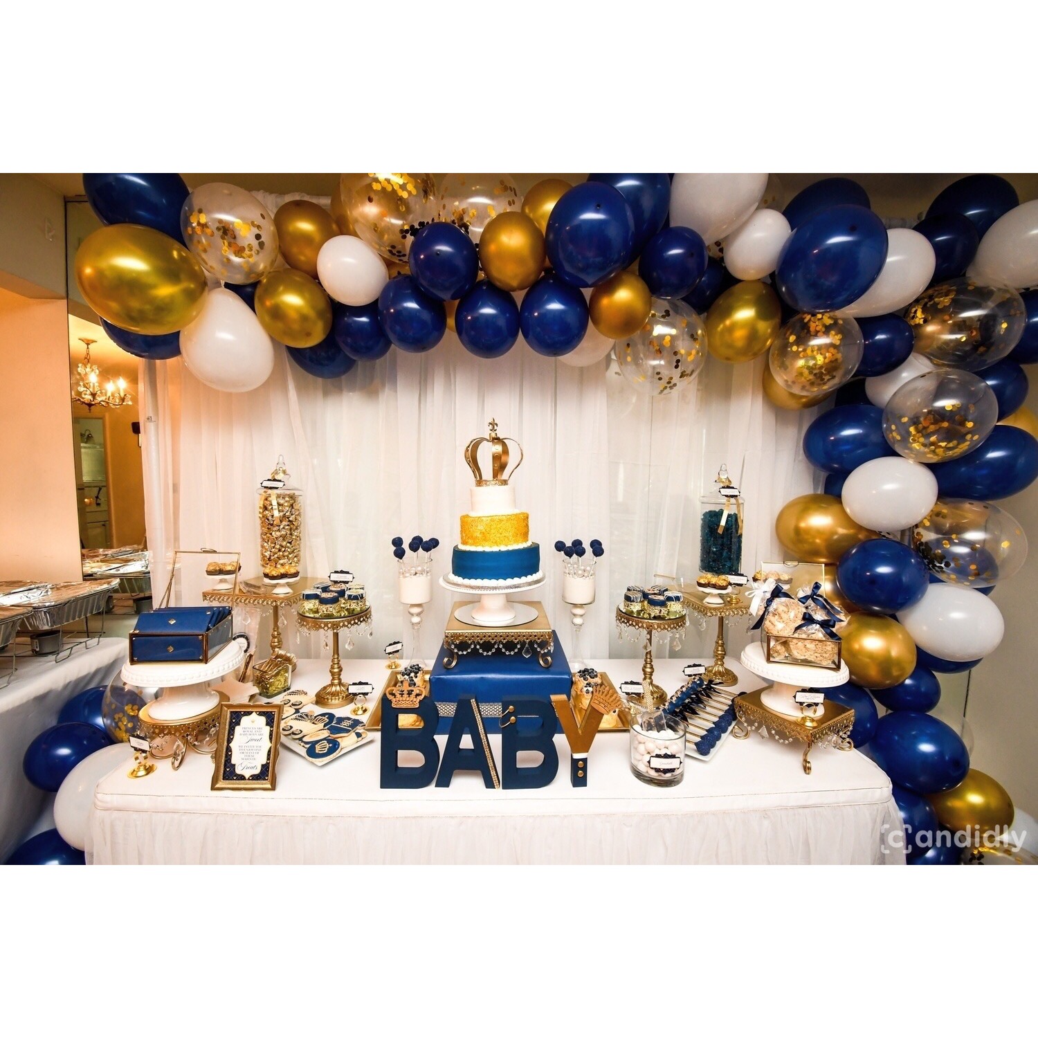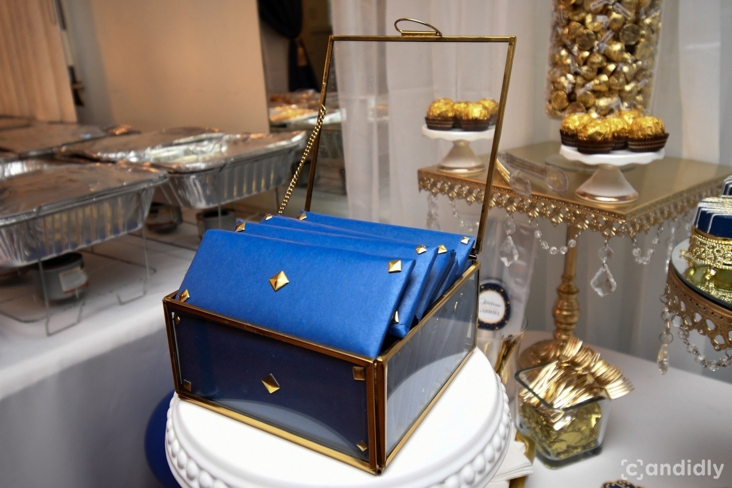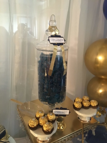 For décor, we used our most regal décor incorporating high and low elements for dimension. The contrast of the navy blue against the white and gold was divine. Some of our favorite accessories were the custom letters, jewelry boxes and gold trinket boxes. And who can forget the backdrop? We were in love with our custom balloon garland with fabulous gold confetti balloons and so was our client!!