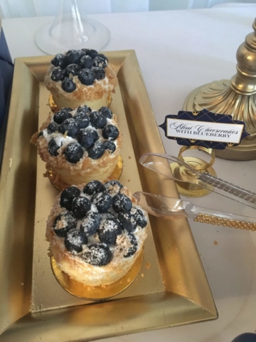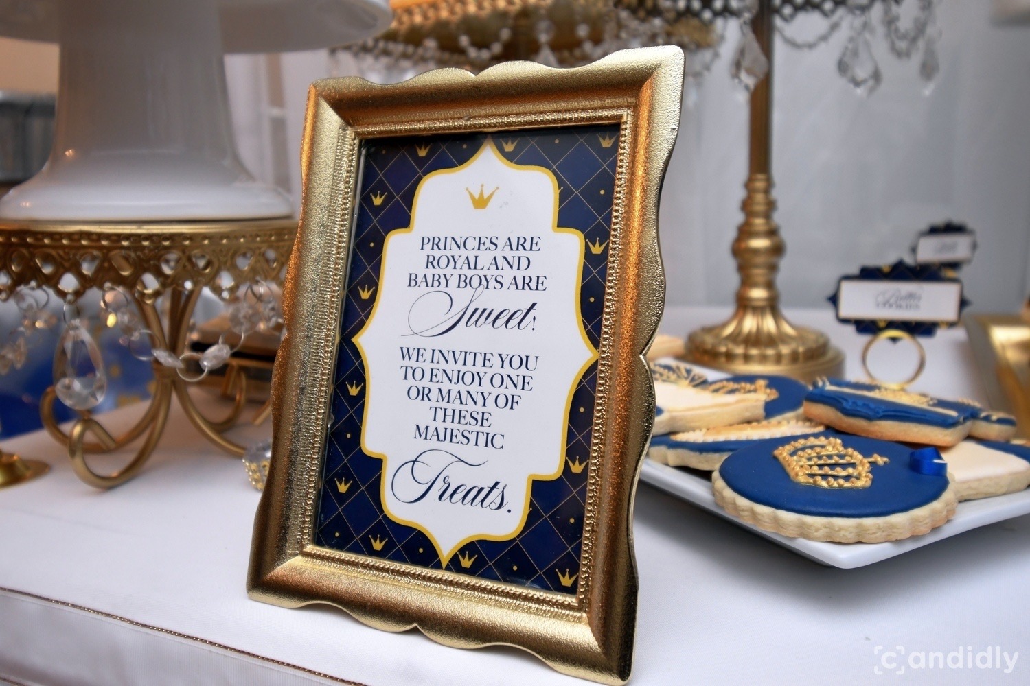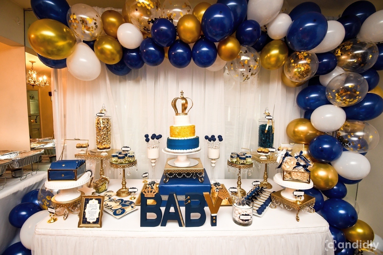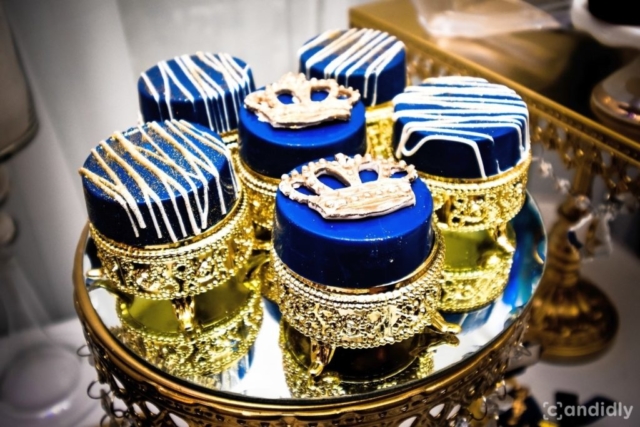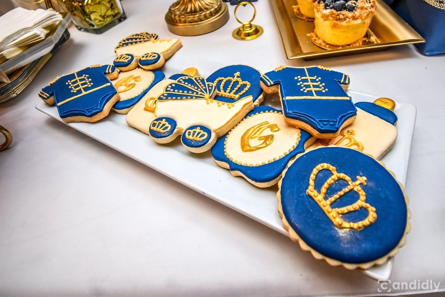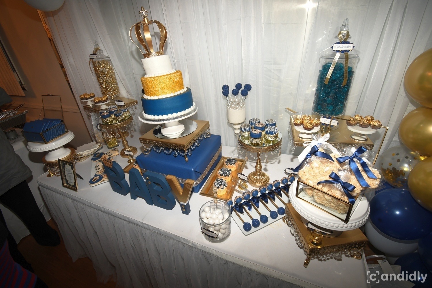 A table fit for a prince!! For this Royal Prince themed baby shower we pulled out ALL the stops. With an extensive dessert menu of 10 items, featuring custom blueberry cheesecakes with crumble, custom wrapped Hersey bars, beautiful crown and swirled chocolate covered Oreos, crown rice krispies treats, and fabulous baby rattle cake pops, this table was sure to meet the needs of our sweet tooth having mom-to-be. We called in on some of our most talented vendors to help us get the job done and they did not disappoint!
